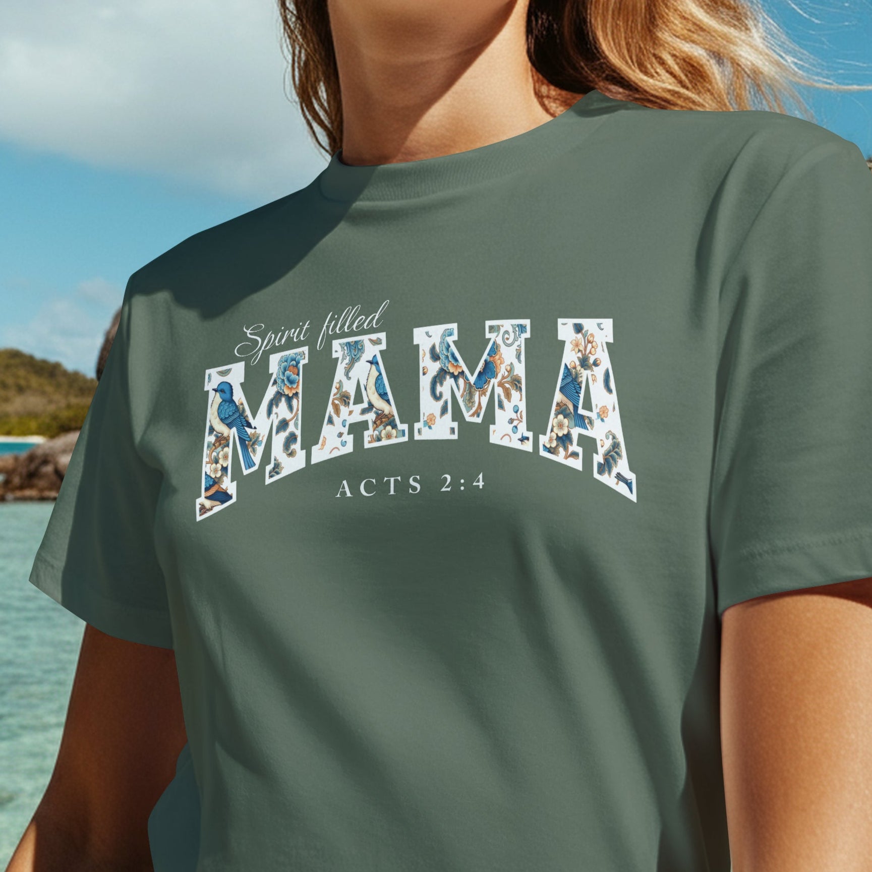 “Celebrate your faith with this ‘Spirit Filled Mama’ T-shirt, inspired by Acts 2:4 — ‘All of them were filled with the Holy Spirit.’ A bold reminder of a mother’s strength through the power of God’s Spirit.”